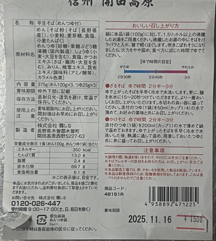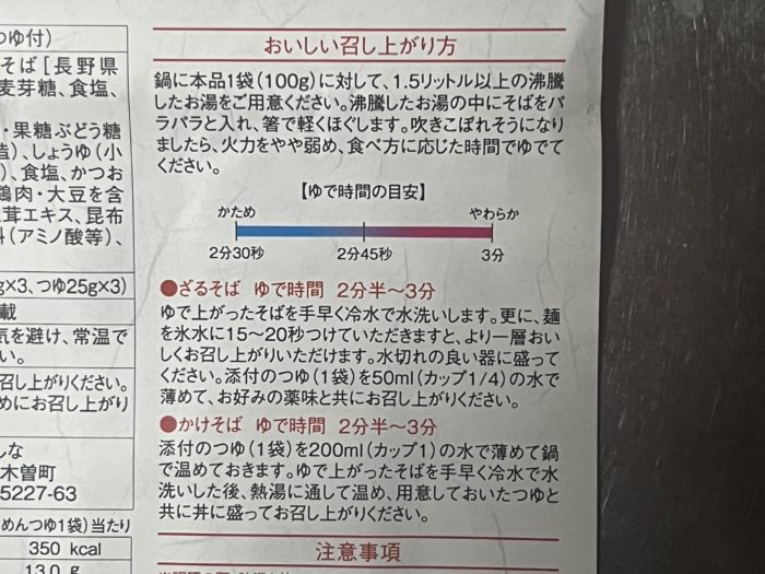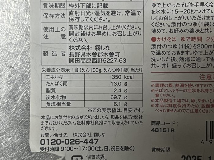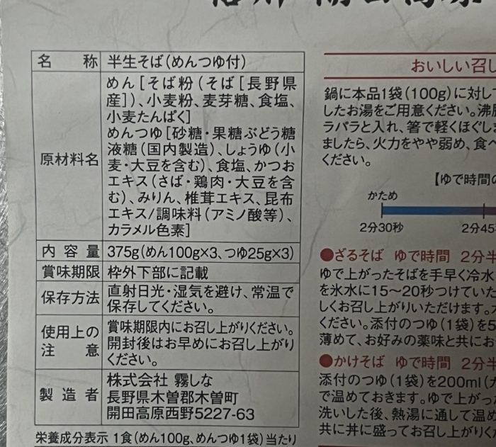 | 原材料 | めん そば粉(長野県産) 小麦粉 麦芽糖 食塩 小麦たんぱく |