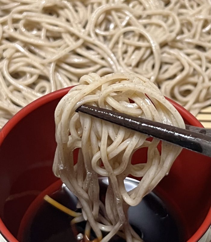 ツユにつければ絡みよく、香りの広がりとモチモチ食感に喉越しから上品な風味が美味しい。風味の奥深さが強い印象。