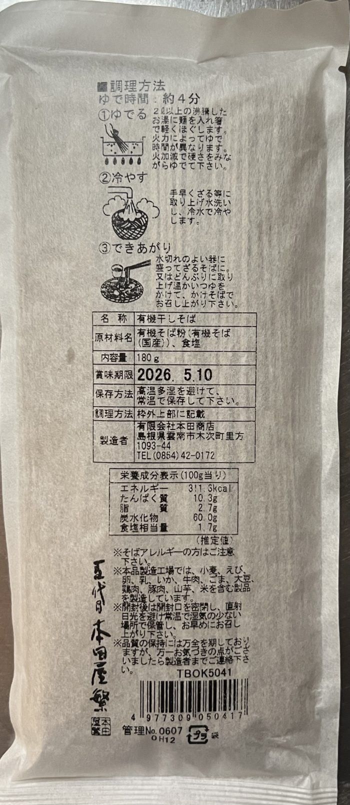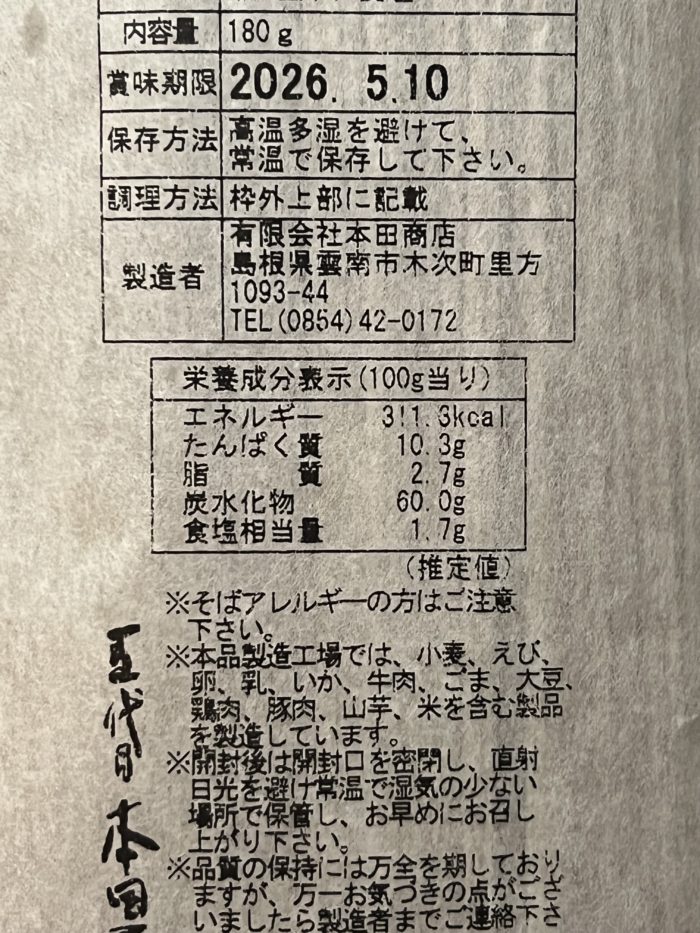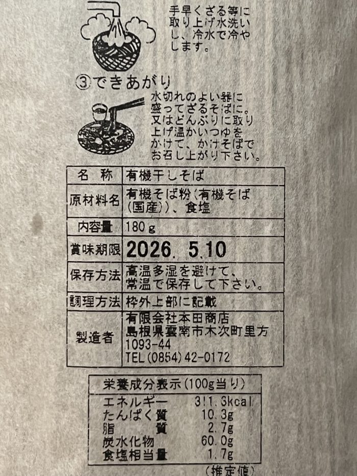 製造は出雲そばでおなじみの本田商店が担当、有機国産そば粉の出はどこなのかは不明。