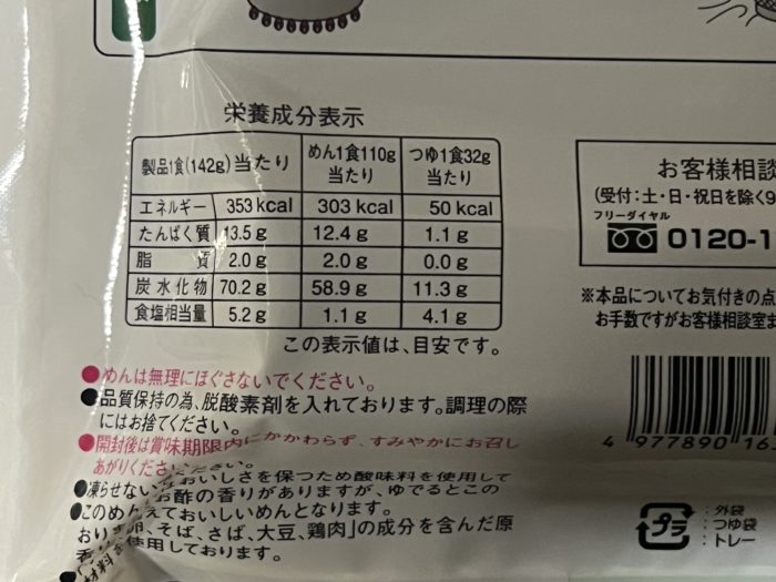 製品1食(142g)当たりめん1食110g当たりつゆ1食32gあたり