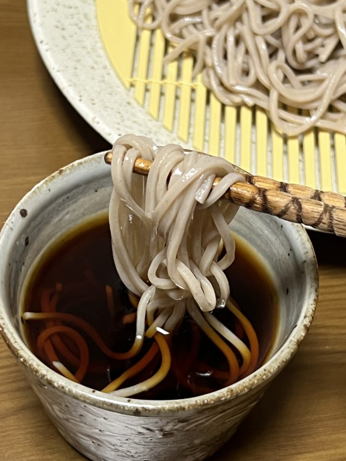蕎麦だけを食べると滑らかな口当たり、ややモチのグニッとした弾力にみずみずしく、爽やかな風味があります。