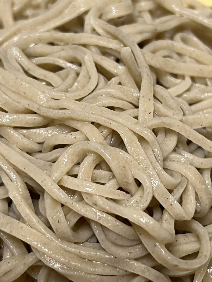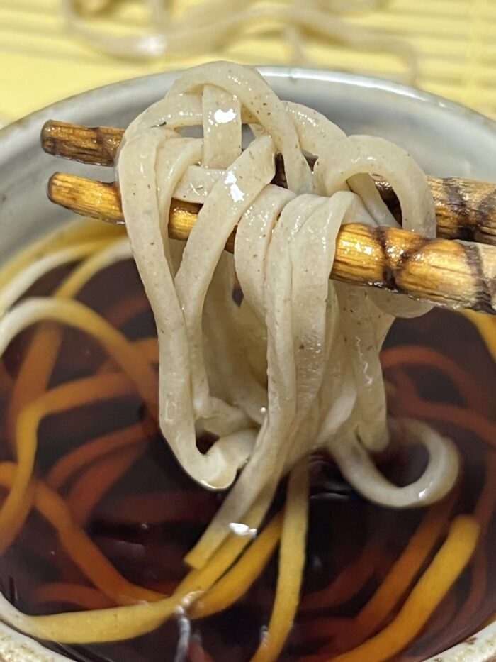 蕎麦だけを食べると滑らか、コシのあるもちもちシコシコな食感に甘みある爽やかな風味が美味しい。