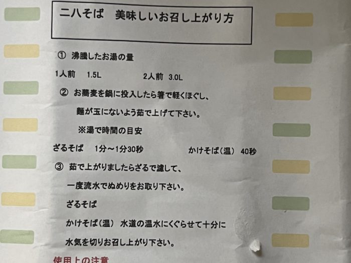 | ゆで時間 | ざるそば:1分30秒 かけそば:1分 |