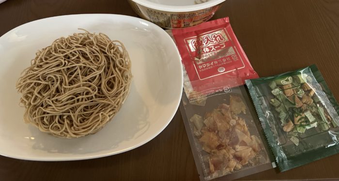 カップから取り出すとめん、後入れ液体スープ、鰹節パック、かやく